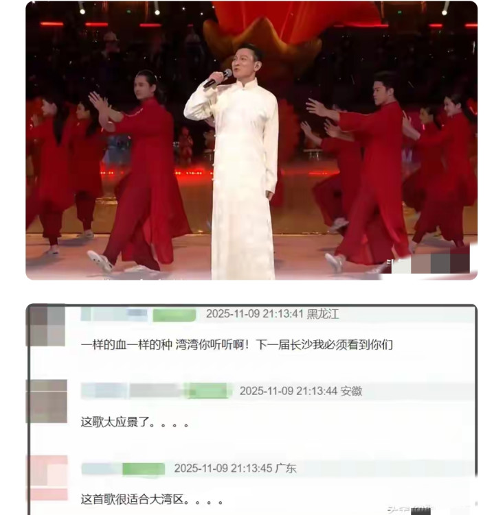 一股身为中国人的骄傲和热血便沸腾起来了,“一样的血一样的种”,万名观众都参入到了大合唱中。