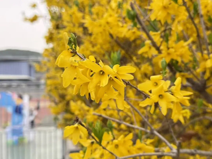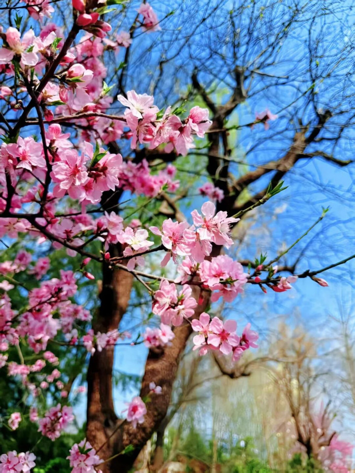 春日的济护,是一场色彩的盛宴。金黄的连翘肆意盛放,满枝繁花如阳光倾泻,点亮了校园的角落,那蓬勃的生机,恰似少年人向上的朝气,在春光里肆意舒展。粉艳的桃花灼灼其华,花瓣娇嫩欲滴,花蕊晕着淡淡绯红,与蓝天相映,美得热烈而纯粹。