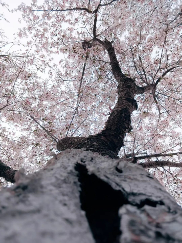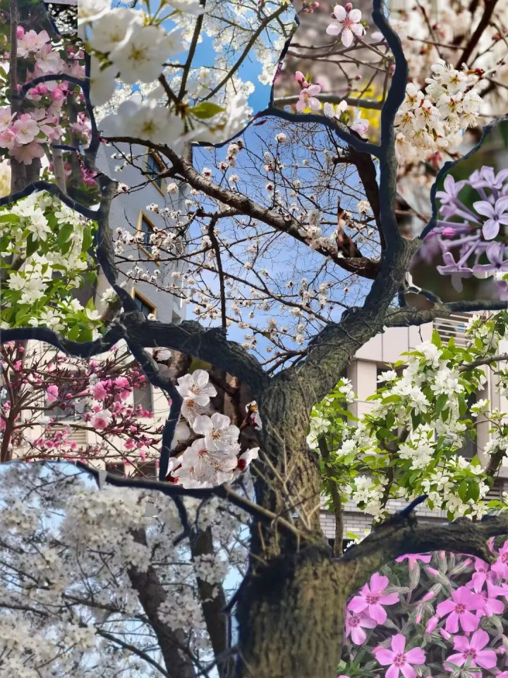 粉白的樱花缀满枝头,是济护春日最动人的注脚。仰拍的镜头里,粗壮的树干托着满树繁花,细碎的花瓣层层叠叠,似春日飘落的云霞,温柔了时光。白日里,樱花枝桠斜斜探过教学楼的窗沿,晨读的学子低头翻书,抬头便撞见满树烂漫,花香混着墨香,在空气里酿成清甜的气息。