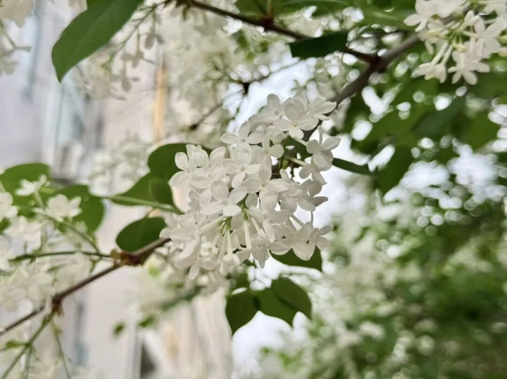 洁白的丁香花悄然绽放,细碎的花瓣簇拥成团,在绿叶间藏着淡淡的幽香。夜色里,丁香花褪去白日的张扬,静静吐露芬芳,与枝头的繁花交织,构成一幅朦胧的春日画卷。还有那草丛间的蓝色小花,星星点点散落其间,如撒落的碎钻,为春日增添了几分灵动的趣味。