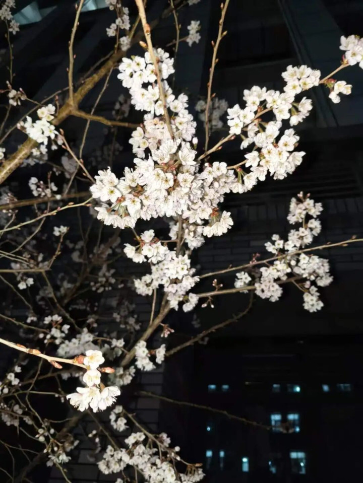 夜色降临时,樱花又添几分朦胧。路灯暖光洒下,花瓣泛着柔和的光晕,枝头繁花与暗黑夜空相映,少了白日的明媚,多了几分静谧的温柔。晚归的行人走过花下,脚步轻缓,生怕惊扰了这一方春日的安宁,花瓣随风轻颤,簌簌落下,似在与行人轻声道别。