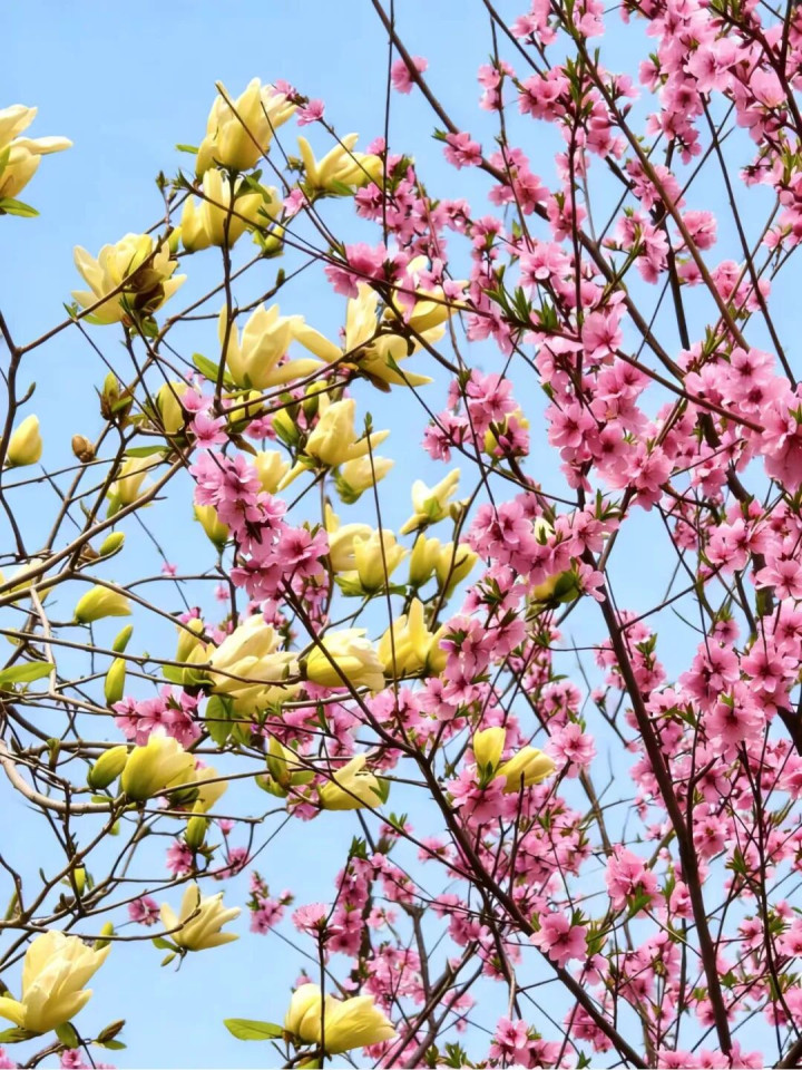 玉兰的盛放更是惊艳。鹅黄的玉兰立于枝头,花瓣饱满舒展,与粉艳的繁花同框,黄与粉的碰撞,撞出春日独有的鲜活。新叶嫩绿欲滴,与繁花相映,每一处细节都藏着春日的温柔,漫步其间,仿佛置身于春日编织的梦境里。