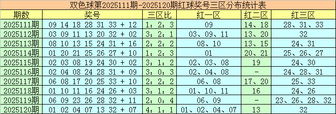 双色球第2025120期开出奖号为:01、02、04、07、13、32+07,其中红球三区比为4:1:1,蓝球开出奇数、小 号、1路号码。