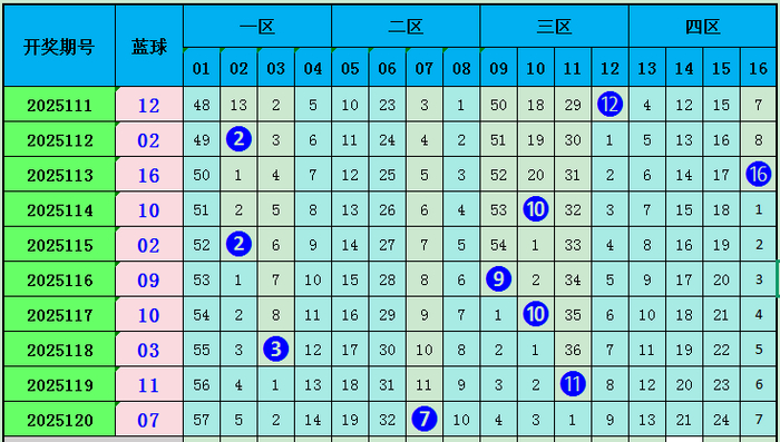 上期蓝球开出号码07,近十期蓝球在一区开3枚,二区开出号码1枚,三区开出5枚,四区开出1枚,区间比3:1:5:1,本期推荐蓝球出现在一区,重点关注02。