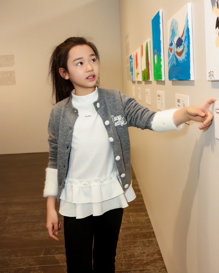 9岁的佟俊言留着一头短发,身穿条纹毛衣搭配黄色休闲裤,看起来非常的内敛。他和小酒窝同框,略显害羞内敛。