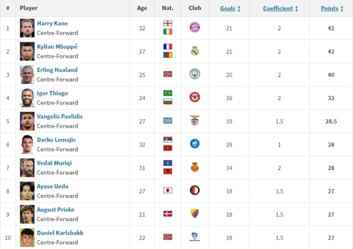 第一:凯恩,德甲/拜仁,21球,42分。