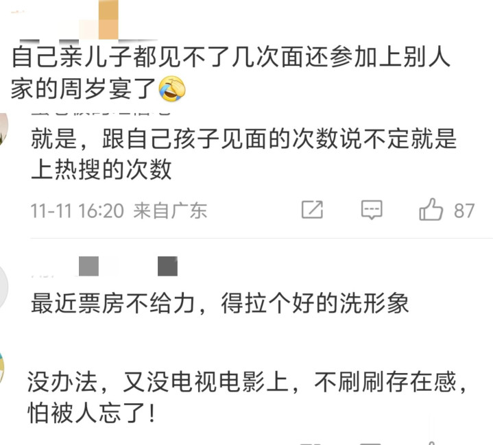 而且他以前营造的形象自从离婚和叶珂闹出那么多事后也回不去了,“人设”已经立不住。往年一年到头不见他带小孩的路透和话题,今年尤其多,而且他居然会在采访的时候主动提起。杨颖经常带小海绵倒是经常可以看到,工作也会带着去。网友怀疑是因为电影票房太差了,空有奖项,没有说服力和讨论度,要在观众面前刷存在感。